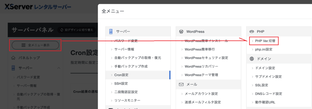 ・「全メニュー表示」 > 「PHP Ver. 切替」