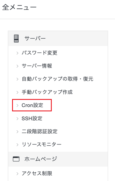 3.「全メニュー表示」 > 「Cron設定」 > 「+Cron設定を追加」