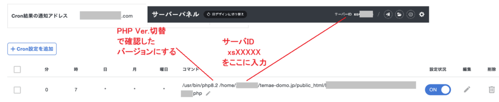 /usr/bin/php8.2 /home/(ここにXServerID)/(ここにドメイン名)/public_html/cron.php