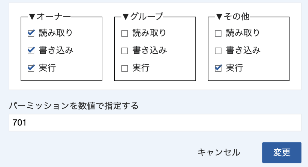 ファイルマネージャーで > スクリプトのパーミッションを「701」にしておくと書いてあるので > ファイルマネージャーで設定した