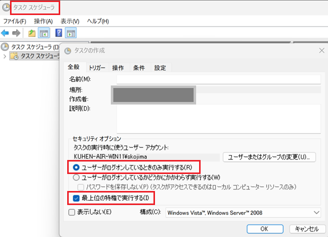 テストで、手動で「タスクスケジューラ」を実行すると成功するが、自動で実行させると失敗する